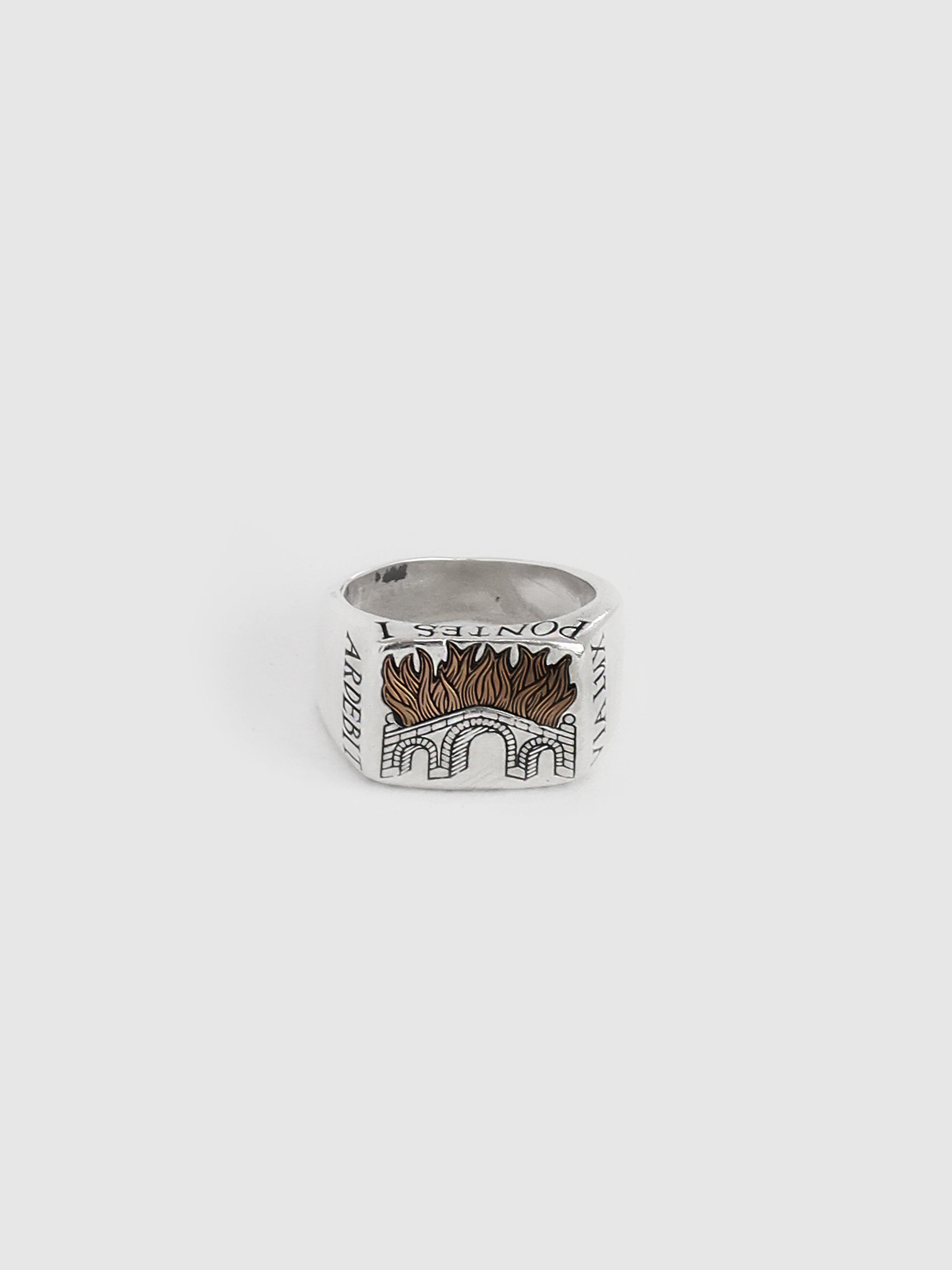 The Burning Bridges Signet reads 'Numquid Via Lux Pontes I Ardebit', meaning, The Bridges I Burn Will Light The Way. The signet is available in solid oxidized sterling silver with an 18k rose gold inlay.